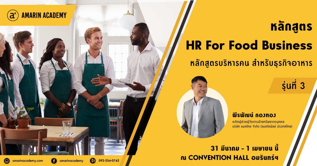 กลับมาอีกครั้งกับหลักสูตร HR for Food Business บริหารคน สำหรับธุรกิจอาหาร รุ่นที่ 3 หลักสูตรที่จะทำให้ผู้ประกอบการเรียนรู้การบริหารบุคลากรอย่างมีประสิทธิภาพ ไขข้อข้องใจปัญหาเรื่องพนักงานลาออกบ่อย ขาด ลา มาสาย ทะเลาะกัน การหาพนักงานที่ดี โครงสร้างเงินเดือน สัญญาจ้างงาน รวมถึงกฎหมายเกี่ยวกับแรงงานต่างๆ ที่ต้องรู้ โดยวิทยากร คือ อาจารย์ พีรพัฒน์ กองทอง ผู้มีประสบการณ์จากธุรกิจอาหารเชนใหญ่อย่าง แมคโดนัลด์ ประเทศไทย ที่จะมาพร้อมแขกสุดพิเศษ งานนี้จะจัดขั้นในวันอังคารที่ 31 มีนาคม – วันพุธที่ 1 เมษายน 2563 เวลา 9.00-17.00 น.