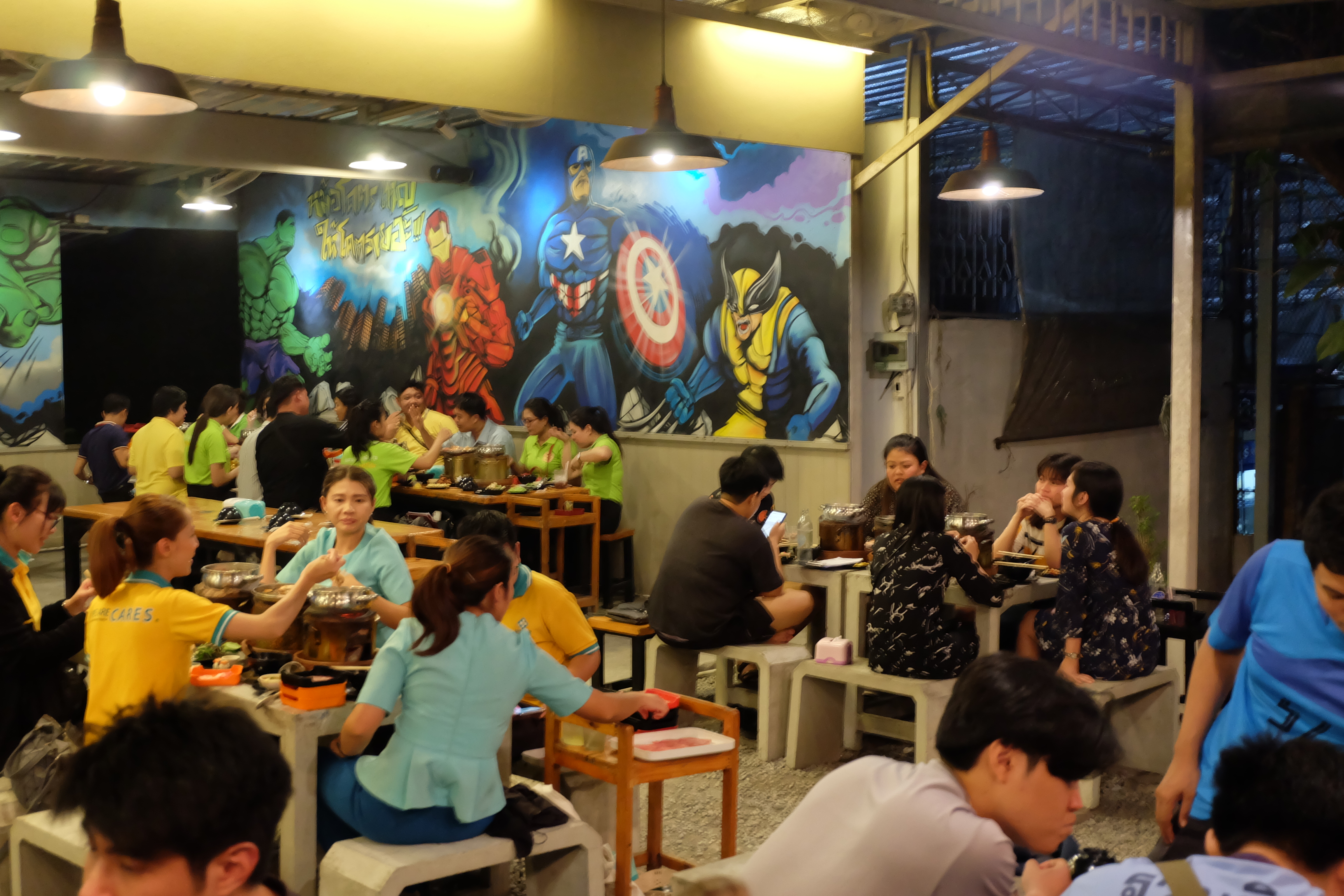 ข้อดีอีกอย่างหนึ่งคือ การเสิร์ฟให้ลูกค้าคือการได้คุยกับลูกค้า ถือเป็นจุดขายของเราเลยนะที่ต่างจากบุฟเฟต์ทั่วไป การได้คุยกับลูกค้าทำให้เรารู้จักลูกค้า ที่ร้านเลยมีลูกค้าประจำเยอะ ลูกค้าจะรู้สึกดีกว่า เป็นเคล็ดลับอีกอย่างหนึ่งที่ได้ใจลูกค้า ซึ่งแน่นอนว่าเราต้องมีการเทรนด์พนักงานอย่างดี เราเทรนด์แบบพี่สอนน้อง เน้นการพูดคุยสอนกัน จำนวนพนักงานตอนนี้หน้าร้านมี 7 คน หลังร้านมี 7-8 คน