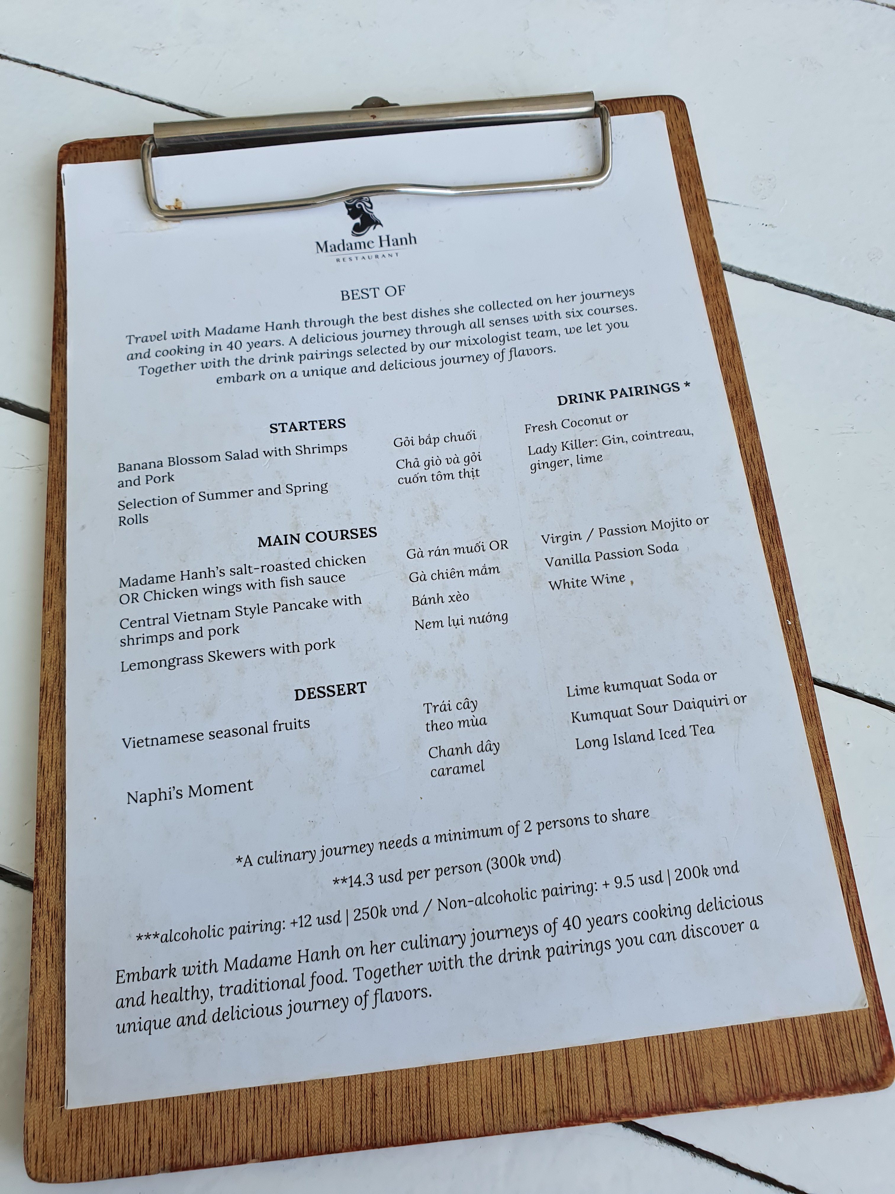 ร้าน Madame Hanh กับเมนูที่มีไม่ถึง 10 รายการ ทดลองสั่งไปแค่ 3 อย่าง กับเครื่องดื่มอีก 2 แก้ว แต่รู้สึกได้ว่าความอร่อยอยู่ในเกณฑ์ที่คุ้มค่าเงิน เนื่องจากความอร่อยนั้นมาจากวัตถุดิบที่ดี การให้ความใส่ใจกับการเลือกวัตถุดิบ เลือกของสด คุณภาพดีในการปรุงอาหารมาเสิร์ฟ ลูกค้ารู้ว่าวัตถุดิบที่ใช้กับราคาอาหารมันคุ้มแล้วที่ลูกค้ายอมเสียเงินไปทาน เพราะว่าวัตถุดิบ คือส่วนสำคัญที่จะทำให้ได้รสชาติอาหารอร่อย  วัตถุดิบเป็นตัวแปรสำคัญของรสชาติอาหาร จะต้องเลือกอย่างถูกต้อง และเลือกอย่างดีที่สุด