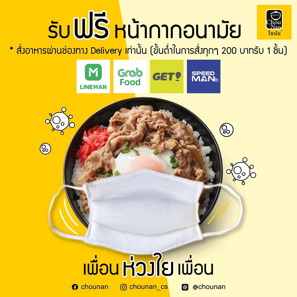 - ด้านออนไลน์ เราจัดให้มีโปรโมชั่นสั่งอาหารออนไลน์ ด้วยการให้ลูกค้าที่สั่งอาหารผ่านช่องทาง Delivery เมื่อสั่งอาหารเป็นจำนวนเงิน 200 บาทขึ้นไป รับฟรีหน้ากากอนามัย 1 ชิ้น ซึ่งหน้ากากอนามัยนี้ก็เป็นหน้ากากอนามัยชนิดเดียวกัน กับที่ใช้ภายในร้าน เราทำโปรโมชั่นนี้ขึ้นมา เพื่ออยากแบ่งปันในช่วงที่หน้ากากอนามัยหายาก ซึ่งกระบวนการในการแพ็คหน้ากาก ก็มีการควบคุมเรื่องความสะอาดปลอดภัยในทุกขั้นตอน