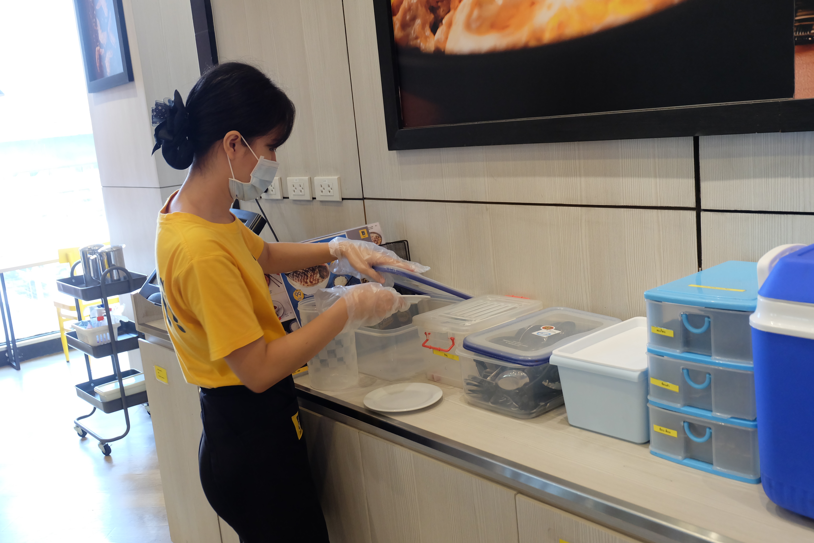 - ช้อน ส้อม ตะเกียบ จากเดิมจะวางเซ็ตไว้ที่โต๊ะเลย ตอนนี้ก็เปลี่ยนมาเป็นเก็บใส่ภาชนะที่มีฝาปิด เมื่อจะใช้งานพนักงานจะเป็นคนหยิบมาให้โดยสวมใส่ถุงมือในการหยิบทุกครั้ง
